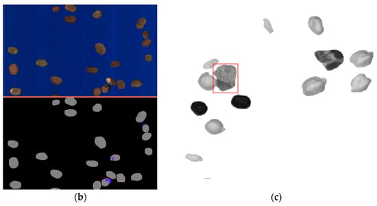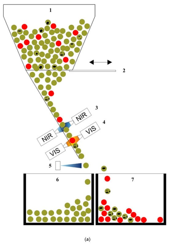 Automatic industrial sorter. (a) Operative scheme of section: 1—hopper; 2—adjustable bulkhead; 3—InGaS NIR cameras; 4—Multispectral VIS cameras; 5—pneumatic ejector; 6—product vessel; 7—contaminant vessel. (b) image VIS camera, (c) image NIR camera.