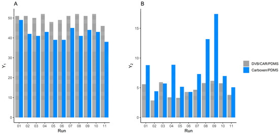 Bar plots (A,B) show the total area (Y1) and the total number of VOCs (Y2), respectively, both obtained in TIC. Y1 and Y2 were considered as responses for CCD, carried out with the two fibers DVB/CAR/PDMS (grey) and Carboxen/PDMS (light blue).