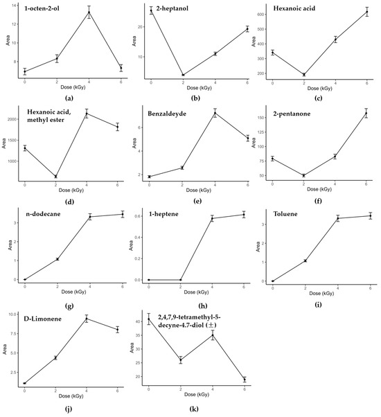 Normalized areas (mean ± standard error) of VOCs, representative for each class in Brie samples at 0 kGy (non-irradiated), 2.0 kGy, 4.0 kGy and 6.0 kGy: (a) 1-octen-2-ol; (b) 2-heptanol; (c) Hexanoic acid; (d) Hexanoic acid, methyl ester; (e) Benzaldeyde; (f) 2-pentanone; (g) n-dodecane; (h) 1-heptene; (i) Toluene; (j) D-Limonene; (k) 2,4,7,9-tetramethyl-5-decyne-4.7-diol (±).