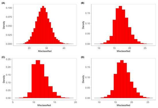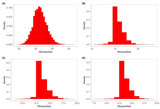 Density of misclassified samples of permutation test, for the results of (A) non-irradiated, (B) X-ray-irradiated at 2.0 kGy, (C) at 4.0 kGy and (D) at 6.0 kGy in PLS-DA model for Brie.