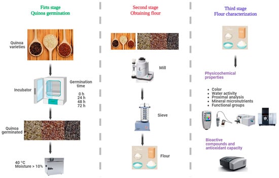 The main objective of the present study is to evaluate the effect of germination (0, 24, 48, and 72 h) on the physicochemical properties, content of bioactive compounds, and antioxidant capacity of three varieties of quinoa white, red, and black, grown in the high Andean area of Andahuaylas, Peru. Using a comprehensive approach, this research seeks to fill the knowledge gap to develop functional quinoa ingredients with improved quality attributes. The complete experimental flow chart is shown in Figure 1.