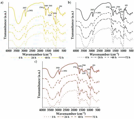 The infrared spectra of the germinated quinoa varieties are shown in Figure 2. A vibrational analysis was carried out through a transmission module to study the functional groups of the samples. The spectra were similar between varieties and germination times, with characteristic groups composed of –CH–, –CH2–, C−OH, and –OH found at wave numbers 2927, 2851, 1023, and 852 cm−1, respectively. Likewise, the C=O group was located at 1741 cm−1, possibly due to carboxylic acids or fats within the flour. The 1649 and 1543 cm−1 bands are attributed to amide I and II, respectively. These bands are associated with vibration modes of the amino groups of amino acids in protein structures. Therefore, they reflect modifications in the secondary protein structure []. In addition, the samples showed a signal at 1239 cm−1 (C–N vibrational mode) coming from amino acids. Analogous results were previously reported by García-Salcedo et al. [] in quinoa, chia, and kiwicha flour and by Contreras-Jiménez et al. [] in quinoa flour. Through analysis of the spectrograms, differences in intensities can be seen throughout the spectrum of the samples, especially between 500 and 2000 cm−1. The native sample exhibits higher intensities, with attenuation observed as germination time increases. This indicates increasing degradation with longer treatment time. However, no new functional group formation was evident from the germination process.