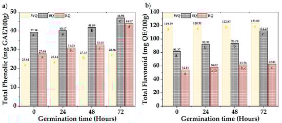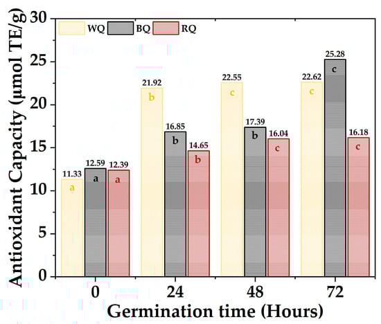 The antioxidant activity capacity equivalent to Trolox of the quinoa varieties is shown in Figure 4; the values ranged between 11.33 µmol TE/g to 22.62 µmol TE/g for white quinoa, between 12.59 µmol TE/g to 25.28 µmol TE/g for black quinoa, and between 12.39 µmol TE/g to 16.18 µmol TE/g. Furthermore, it was found that most of the samples present significant differences (p-value < 0.05), with the antioxidant activity being higher during 72 h, especially for BQ and WQ. The polyphenolic compounds responsible for antioxidant capacity are secondary metabolites present in plants, which are formed during their development and under stress conditions; these include simple phenols, phenolic acids, coumarins, flavonoids, stilbenes, hydrolyzable and condensed tannins, lignans, and lignins [,]. Furthermore, these polyphenols could be altered during germination, increasing their content and antioxidant capacity [].