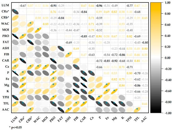 The correlation analysis (Figure 5) showed a significant negative association between protein content and lightness values (r = −0.91); this inverse relationship agrees with previous studies that report lower lightness in flours with higher protein content [], the increase in proteins during germination increases the opacity of the flours by providing more excellent light dispersion, thus reducing lightness values []. The chrome a* (red/green) was positively correlated with proteins (r = 0.76) and negatively with carbohydrates (r = −0.84). This is consistent with the previous point, indicating that the higher the protein content, the higher the reddish tone. The water activity and moisture are strongly correlated (r = 0.83), which makes sense since both parameters are related to the aqueous content []. The fat content negatively correlates with the ashes (r = −0.69). This may indicate a dilution effect; the higher the fat content, the lower the ash content. There is a positive correlation between total flavonoids and antioxidant capacity (r = 0.61); flavonoids are a type of phenolic compound with particular chemical structures that confer a high antioxidant capacity [,]. The positive correlation indicates that flavonoids are the primary metabolites responsible for the antioxidant capacity in these samples of quinoa. Likewise, the high correlation between proteins and phenolic compounds (0.82) could be seen, associated with stress during germination that increases the levels in the germinated grains.