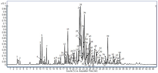 The propolis sample was dewaxed and extracted as described by Cea-Pavez et al. [25]. The resulting PE was reconstituted at a concentration of 5 mg·mL−1 in aqueous ethanol 70% and analyzed using HPLC-ESI-QTOF-MS/MS, obtaining the chromatogram shown in Figure 1. The main compounds were automatically detected with a molecular feature extraction algorithm applying a volume threshold of 0.3% with respect to the main peak. As a result, 66 compounds were detected and tentatively identified whenever possible by interpretation of their MS and MS/MS spectra and comparison with databases and the previous literature. Among the detected compounds, 58 could be identified in the propolis extract. All detected compounds with their MS data and putative identification are detailed in Table 1.