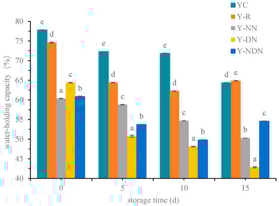 The water-holding capacity (WHC) of five groups of yogurts (YC, Y-R, Y-NN, Y-DN, and Y-NDN) at day 0, day 5, day 10, and day 15, respectively (The data are represented as mean ± SD, n = 3. Means with the different letter are significantly different.).