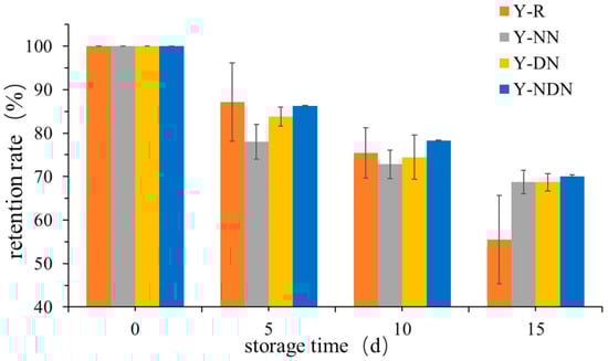 The retention rate of four groups of yogurts (Y-R, Y-NN, Y-DN, and Y-NDN at day 0, day 5, day 10, and day 15, respectively) (mean ± SD, n = 3).
