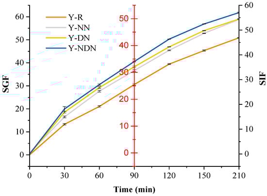 Figure 5 displays the resveratrol bioaccessibility results of Y-R, Y-NN, Y-DN, and Y-NDN, being 50.86%, 49.7%, 54.45%, and 57.05%, respectively, after in vitro gastrointestinal digestion. There was a significant alteration in the resveratrol bioaccessibility between each group (p < 0.05), and the Y-NDN group showed the highest resveratrol bioaccessibility.