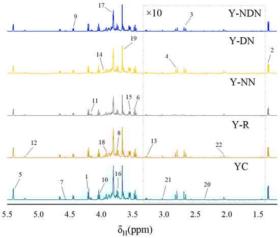 Typical 600 MHz 1H NMR spectra of undigested yogurt from YC, Y-R, Y-NN, Y-DN, and Y-NDN on day 0. The region of δH 1.4–δH 3.3 ppm was vertically magnified by 10 times, and the signals are assigned in Table 3.