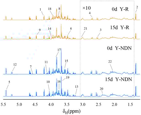 Typical 600 MHz 1H NMR spectra of Y-R and Y-NDN yogurts after digestion on day 0 and day 15. Simultaneously expand the peak area of δH 1.4–δH 3.3 ppm by 10 times; the numbered signals are depicted in Table 3.