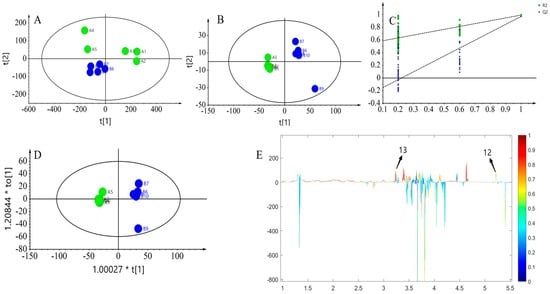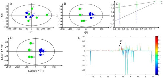 Multivariate analysis of the five yogurts before and after digestion at day 15: (A) cross-validated PCA score plot (R2X = 0.918, Q2 = 0.737); (B) cross-validated PLS-DA score plot (R2X = 0.7, Q2 = 0.901); (C) permutation experiment of PLS-DA model (number of permutations n = 200); (D) OPLS-DA score plot for yogurt (R2X = 0.7, Q2 = 0.902, p = 0.009); and (E) corresponding correlation coefficient loading plots (R2X = 0.72, Q2 = 0.933). The green circle represents the five groups of formulated yogurts on the 15th day, while the blue circle represents the digesta of five groups of yogurts after in vitro digestion on the 15th day.