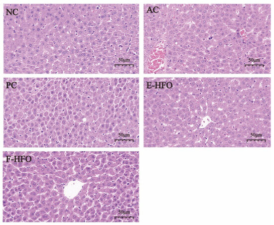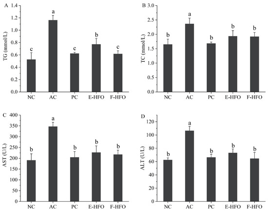 Serum levels of TC and TG have been shown to be positively correlated with lipid oxidation [13]. AST and ALT are the main metabolic enzymes in liver cells and can be used as the main sensitive indicators of liver health [14]. These enzymes play a crucial role in assessing liver function. As shown in Figure 4, the levels of serum TC, TG, AST, and ALT were significantly greater in the AC group compared with NC (p < 0.05), indicating the successful establishment of the rat model of alcohol-induced liver injury. Alcohol intake resulted in elevated levels of serum TC, TG, AST, and ALT in rats, disrupting lipid regulation. The concentrations of TC, TG, AST, and ALT were markedly reduced in both the PC and HFO groups in comparison to the AC group (p < 0.05). Nevertheless, no notable differences were observed when compared to the NC group (p < 0.05). These findings indicate that HFO intervention can significantly reduce the serum TC, TG, AST, and ALT levels and improve the negative effects of excessive alcohol intake on the liver.