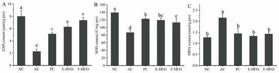 Effects of high Fischer ratio oligopeptides on oxidative stress in the liver of rats with alcohol-induced liver injury ((A) effect of HFO on GSH, (B) effect of HFO on SOD, and (C) effect of HFO on MDA). There were significant differences between the values marked with different letters (p < 0.05).