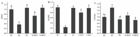 The mRNA expression levels of alcohol metabolism enzymes ((A) qPCR analysis of the mRNA level of ADH4, (B) ALDH2, and (C) CYP2E1 in liver tissue). Different letters indicate significant differences (p < 0.05).