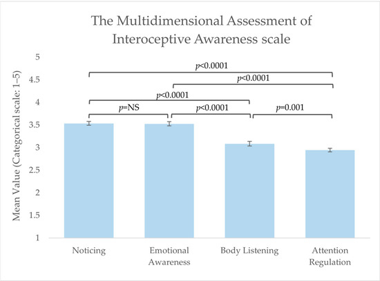 Mean score values from subscales of the Multidimensional Assessment of Interoceptive Awareness (MAIA) scale. Significant differences were obtained between the four subscales. NS: non-significant.