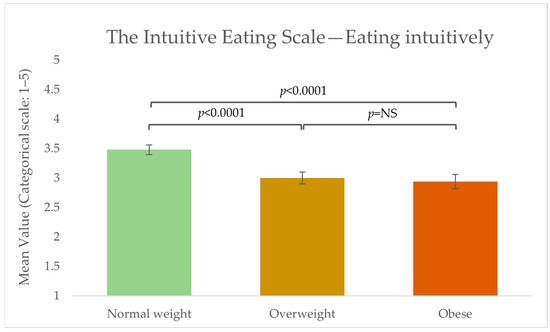 To investigate intuitive eating, the respondents were asked to answer the reliance on internal hunger and satiety cues’ subscales from the IES [35]. The mean score across the total group of respondents was 3.2 (±0.98), thus slightly above the middle value, indicating a tendency to eat intuitively. Significant differences were found between the BMI groups, with the group of normal weight respondents being significantly more intuitive in their eating than the overweight and obese group (see Figure 2).