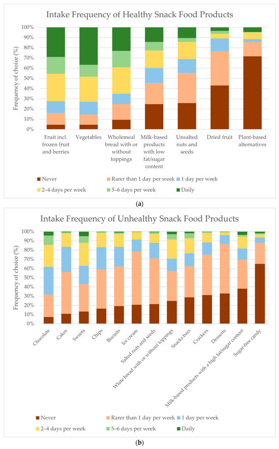(a) Intake frequency of healthy snack products consumed within the last week as reported by all respondents (n = 286). (b) Intake frequency of unhealthy snack products consumed within the last week as reported by all respondents (n = 286).