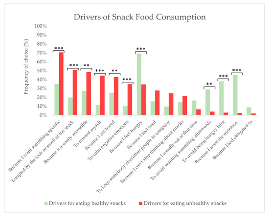 Drivers of snack food consumption for healthy and unhealthy snacks among all respondents (n = 286). Stars indicate a level of significance when comparing the drivers for consuming healthy snack foods with those for unhealthy snack foods: ** = p < 0.01, *** = p < 0.001.