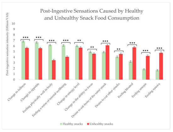 Post-ingestive sensations felt after eating healthy and unhealthy snacks among all respondents (n = 286). Stars indicate a level of significance when comparing the post-ingestive sensations experienced after eating healthy snack food with those experienced after eating unhealthy snack food: ** = p < 0.01, *** = p < 0.001.
