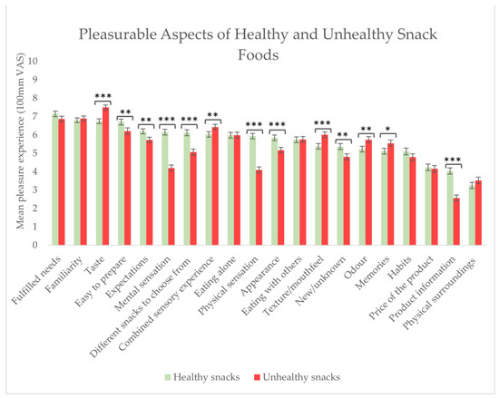 Food-related aspects that contributed to pleasure when eating healthy and unhealthy snacks reported among all respondents (n =286). Stars indicate a level of significant differences when comparing the importance of that aspect of pleasure when consuming healthy snack foods with its importance for unhealthy snack foods: * = p ≤ 0.05, ** = p < 0.01, *** = p < 0.001.