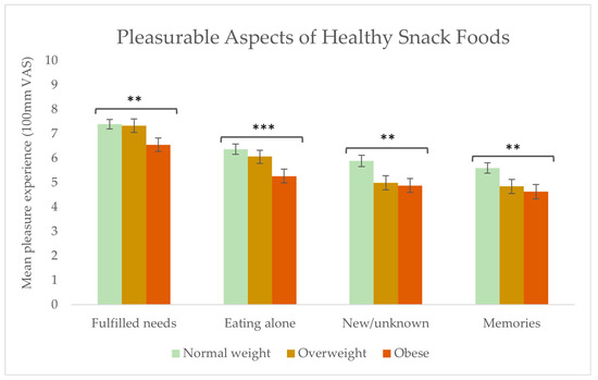 Food-related aspects contributing to pleasure when eating healthy snacks among the three groups: normal weight (n = 130), overweight (n = 80), and obese (n = 76). Stars indicate a level of significance when comparing the importance of that aspect of pleasure between the three BMI groups in relation to consuming healthy snack foods:, ** = p < 0.01, *** = p < 0.001.