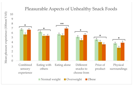 Food-related aspects contributing to pleasure when eating unhealthy snacks among the three groups: normal weight (n = 130), overweight (n = 80), and obese (n = 76). Stars indicate a level of significance when comparing the importance of that aspect of pleasure between the three BMI groups in relation to consuming unhealthy snack foods: * = p ≤ 0.05, ** = p < 0.01.