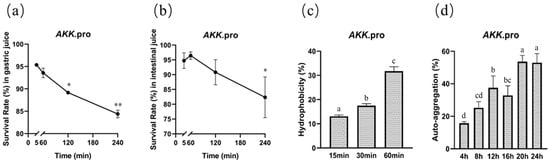 General characteristics of A. muciniphila PROBIO. (a) Strain tolerance to artificial gastric fluid. (b) Strain tolerance to artificial intestinal fluid. (c) Adhesion of AKK PROBIO to hydrocarbons. (d) Auto-aggregation percentages of AKK PROBIO. The asterisk (*/**) indicates a significant (p < 0.05) or highly significant (p < 0.01) difference. Different letters indicate significant differences (p < 0.05).