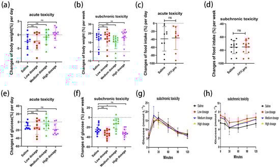 Changes in glucose metabolism in acute and sub-chronic toxicities of A. muciniphila PROBIO in normal mice. (a,b) Body weight; (c,d) food consumption; (e,f) blood sugar; (g) glucose tolerance; (h) insulin tolerance. “ns” indicates no significant difference between the two groups (p > 0.05); asterisk (*) indicates p < 0.05.