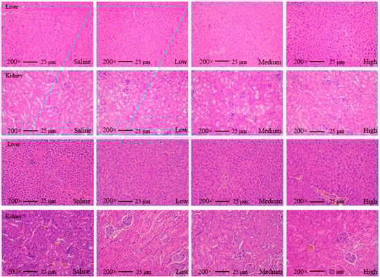 Tissue slice images of the liver and kidney from mice in the acute toxicity experiment (top two) and sub-chronic toxicity experiment (bottom two) at different concentrations of A. muciniphila PROBIO.