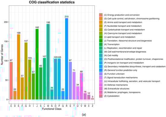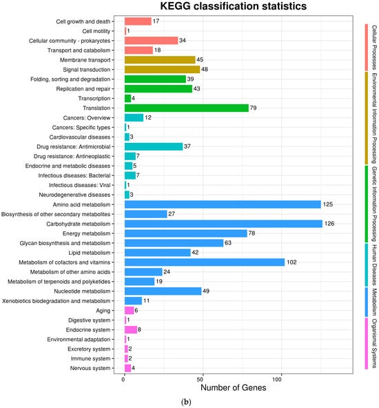 The complete genome sequences of Akkermansia muciniphila PROBIO are available at NCBI SRA accession number PRJNA1065580. The genome of AKK PROBIO consists of a single chromosome measuring 2,863,710 base pairs, with a GC content of approximately 55.32% (Table S3). Utilizing the integrated data from genome sequencing, gene prediction, and non-coding RNA prediction, a gene circle diagram was constructed (Figure 4). To gain further insights into the functional annotation of genes, searches were conducted in the COG, KEGG, and GO databases. Out of the total predicted genes, 59.10% were successfully assigned to COG categories (Figure 5a). Among these assignments, 210 genes were associated with general function prediction, 195 genes were linked to cell wall, cell membrane, and envelope synthesis, 182 genes were involved in translation, ribosome structure, and biosynthesis, and 168 genes were associated with amino acid transport and metabolism. Additionally, 38.91% of the genes could be assigned to KEGG annotation (Figure 5b), with a total of 666 genes found to be related to metabolism. Specifically, 126 genes were involved in carbohydrate metabolism, 125 genes were associated with amino acid metabolism, and 102 genes were linked to functional factors and vitamin metabolism. The GO analysis revealed that there were 1322 genes associated with molecular function, 1332 genes associated with cellular components, and 1439 genes involved in biological processes (Figure 5c). Only one virulence factor gene, tufA, was identified in the VFD database (Table S3). According to the PathogenFinder database, AKK PROBIO was predicted to be a non-human pathogen (Figure S1). These results indicated that AKK PROBIO was non-toxigenic at the genetic level.