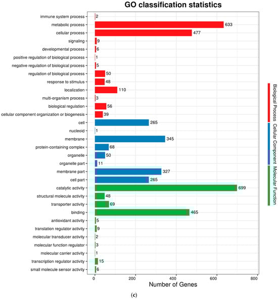 Functional distribution of COG annotation (a), KEGG annotation (b), and GO annotation (c). The X axis represents the number of unigenes. Unigenes were grouped into 23 KOG categories in the COG functional classification.