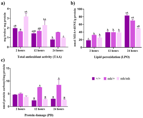 Figure 1. Antioxidant status. (a) Total antioxidant activity (TAA) expressed in mg Trolox mg −1 protein; (b) lipid peroxidation (LPO) expressed in nmoles of MDA + 4HNE g−1 protein; (c) protein damage (PD) expressed in nmoles of carbonyl content mg−1 protein in meat from AV (+/+, mh/+, mh/mh) biotypes throughout the postmortem period studied (2 h to 24 h). For a biotype, lowercase letters indicate significant differences between times. For a given aging time, capital letters indicate significant differences between biotypes (p < 0.05).