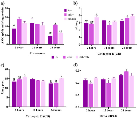 Figure 2. Proteolytic activities. (a) Proteasome activity expressed in arbitrary fluorescence units AMC mg−1 protein; (b) cathepsin B activity expressed in mU mg−1 protein; (c) cathepsin D activity expressed in U mg−1 protein; (d) ratio of cathepsin B/D (CB/CD) in meat from AV (+/+, mh/+, and mh/mh) biotypes throughout the postmortem period analyzed (2 h to 24 h). For a biotype, lowercase letters indicate significant differences between times. For a given aging time, capital letters indicate significant differences between biotypes (p < 0.05).
