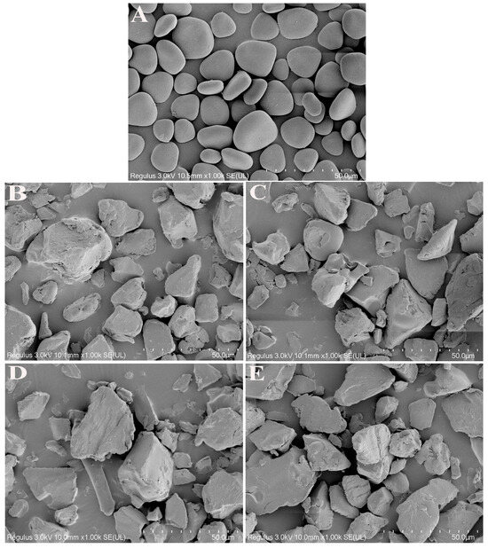 Figure 1A–E show the SEM images of YS, EYS, and EYS-KGM. YS appeared as an elliptical particle with a smooth and crack-free surface. In comparison to native YS, the surface roughness of all extruded samples increased and exhibited an irregular rock-like shape [26]. As the KGM content increased, the large particle content of EYS also increased. This might be because the extrusion caused the molecular rearrangement of starch, creating a structure in which KGM aggregated with starch molecules. In addition, previous studies have indicated that extrusion-treated KGM particles had a larger particle size than untreated ones [27].