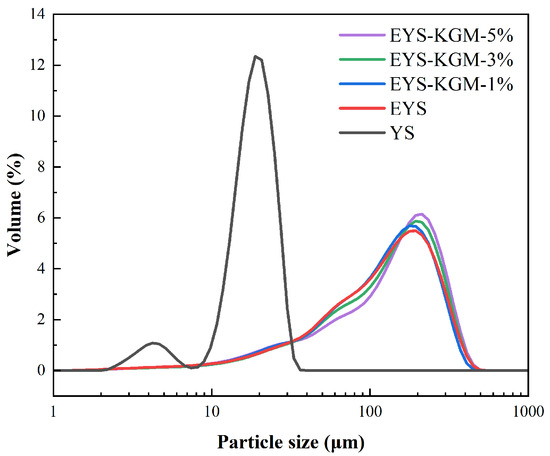 The particle size distributions of YS, EYS, and EYS-KGM are shown in Figure 2. The particle sizes of native YS were mainly concentrated in two ranges of 2–7 μm and 10–30 μm. The number of large particles increased in the sample after the extrusion treatment. The particle size of the peak volume fraction tended to move toward larger sizes when more KGM was added. In the description of particle size distribution, the D-value is the most commonly used parameter, which is used to represent the intercept of cumulative mass percentage [28]. From Table 1, the extruded YS have higher values of D(4,3), D90, D50, and D10 than those of native YS.