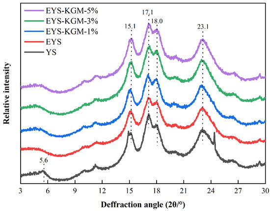 Figure 3 displays the XRD patterns of YS, EYS, and EYS-KGM. Generally, the crystal types of starch are divided into A, B, and C types. Starches that show strong double peaks at about 17° and 18° can be classified as type A, while those that have a prominent peak at about 5.6° and a wide peak at about 23° are considered type B. The type C is a hybrid of type A and type B; it has broad peaks at approximately 17° and 23°, with some minor peaks around 5.6° and 15° [29]. YS showed a typical C-type crystalline structure because its diffraction peaks were located at 5.6°, 15.1°, 17.1°, 18.0°, and 23.1° [30]. After the extrusion treatment, the diffraction peak at 5.6° disappeared. The diffraction peaks of EYS were located at 15.1°, 17.1°, 18.0°, and 23.1°, exhibiting an A-type structure. The relative crystallinity (RC) of EYS decreased from 23.37% to 18.30% compared to YS, which was due to the fact that extrusion destroyed the natural arrangement of starch molecules and transformed it into an amorphous structure [31]. Furthermore, with the increase of KGM, the RC of EYS-KGM-1%, EYS-KGM-3%, and EYS-KGM-5% increased to 20.10%, 21.07%, and 22.30%, respectively, which is in line with Ning’s findings [20]. The interaction between KGM and branched starch chains led to the rearrangement of starch helical structures and an improvement in starch recrystallization [32].