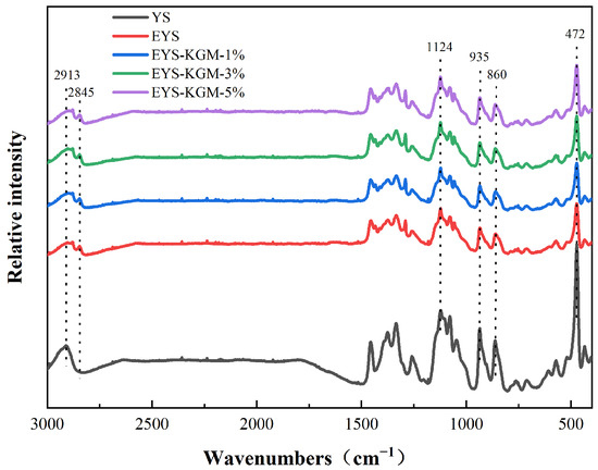 The Raman spectra are shown in Figure 4; the peak intensity of YS became weaker after extrusion treatment. The spectral band at 2800~3000 cm−1 belonged to the C-H stretching vibration [33]. The spectral band at 800~1500 cm−1 was the fingerprint region of YS. The strong spectral band at 472 cm−1 corresponded to the backbone vibration region of the cyclic ring of pyranose in YS, and the FWHM of the absorption peak here could be used for characterizing the short-range ordering of the YS. In general, as the short-range order increased, the FWHM at 472 cm−1 decreased [34,35]. From Table 1, the FWHM of extruded YS was remarkably higher than that of the native one, which indicated that the extrusion resulted in a reduction of the double helix structure of YS and a decrease in its short-range orderliness. In addition, compared to EYS, the FWHM of EYS-KGM decreased with the increase of KGM content, resulting from an enhanced hydrogen bond of KGM with YS molecules.