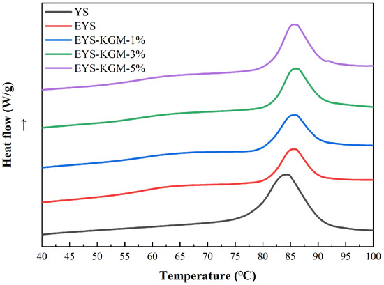 As shown in Figure 5, all starch samples showed typical starch gelatinization peaks, and the specific gelatinization parameters are listed in Table 2. It can be observed that extrusion increased the gelatinization temperature of the starch. This may be due to the fact that extrusion treatment enhanced the interaction of the amylose with either the amylose or the amylopectin, which inhibited the granule swelling and delayed the gelatinization [36]. Additionally, a reduction in the double helical structure after extrusion treatment also led to a lower enthalpy (ΔH) of gelatinization. When KGM was added from 0% to 5%, EYS-KGM-5% gave the highest gelatinization temperature (TO, TP, TC). In general, KGM causes an increase in parameters (TO, TP, TC) [37]. Moreover, extrusion and KGM treatment increased the gelatinization temperature range (Tc–TO) from 12.21 to 14.41 °C. Compared to EYS, the EYS-KGM-1%, 3% and 5% showed a gradual increase in ΔH from 6.92 J/g to 9.60 J/g. This was due to the crystalline and helix structure enhanced with increasing KGM content [32]. Previous research has indicated that KGM could increase the gelatinization temperature and ΔH of starch [38].