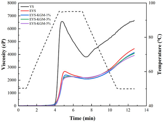 Figure 6 and Table 2 exhibit the pasting properties of YS, EYS, and EYS-KGM. The peak viscosity (PV) indicates the equilibrium point when starch granules absorb water and swell, and the breakdown viscosity (BD) is a reflection of the shear resistance of starch at high temperatures while final and setback viscosity (FV and SB) are related to the short-term retrogradation of amylose [42]. Compared to native YS, PV, BD, FV, and SB of extruded YS samples were significantly reduced. The research showed that the gelatinization property of starch was closely related to the particle size and swelling degree of starch particles [43]. During extrusion, starch pasting and degradation occurred, starch granules lost their integrity, and their swelling degree decreased, resulting in viscosity loss [36]. When the addition of KGM increased, the PV of EYS-KGM gradually decreased from 2614 to 2297 cP, indicating better mobility, which was because KGM could smooth the flow and inhibit the abrasion of starch granules. In addition, KGM could prevent the swelling of starch granules, thereby reducing PV [44]. The BD of EYS-KGM also gradually decreased from 551 to 43 cP with increasing the addition of KGM due to higher stability during heating and stirring. As the KGM addition increased, the SB of EYS-KGM also reduced from 2216 to 1676 cP because a stronger interaction between amylose and more KGM inhabited the short-term retrogradation of amylose [45].