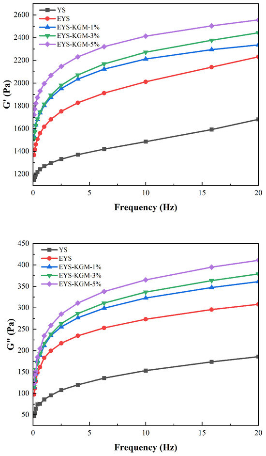 Figure 7 demonstrates the rheological properties of YS, EYS, and EYS-KGM. The storage modulus (G′) and loss modulus (G″) are respectively related to the elastic and viscous properties of the sample [46]. From Figure 6, compared to native YS, extruded YS samples showed a significant increase in both G′ and G″, which indicated that the elasticity and viscosity of YS gels gradually increased with the increase of KGM content. This could be a result of the reorganization of amylose molecules that have been released through the pores and cracks on the surface of the starch granules when mixed with KGM during the extrusion process. This reorganization increased the stiffness and formed a stronger gel network structure [47].