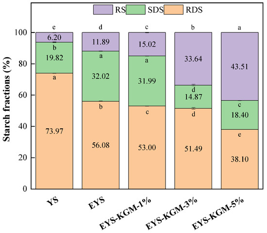 RDS, SDS, and RS contents of YS, EYS, and EYS-KGM. YS, yam starch. EYS, extruded YS. KGM, konjac glucomannan. Different letters for RDS, SDS or RS indicate a significant difference (p < 0.05).