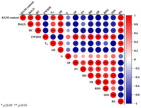 Figure 9 shows the correlation analysis results between the KGM content and indexes of EYS-KGM. KGM content was significantly positively correlated with D(4,3), RC, TP, ΔH, and RS content, and significantly negatively correlated with FWHM, SP, PV, BD, RDS content, and SDS content. Meanwhile, in terms of digestibility, there was a significant positive correlation between RS content and KGM content, D(4,3), RC, TP, ΔH, and a significant negative correlation between RS content and FWHM, SP, BD, SB. Thus, we can conclude that the addition of more KGM improved the long-range and short-range structure of EYS, ultimately increased thermal stability and gel strength, and reduced the accessibility between the digestive enzymes and starch, leading to a decrease in starch digestibility.