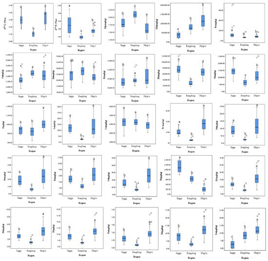 Box plots of stable isotope ratio and mineral content in Pu-erh tea in different regions. a–c in the same row indicated that there are significant differences among regions at p < 0.05 level. Note: ◦ indicates outliers, and the number in the upper right corner represents the number of in-dividuals that are outliers; * denotes outliers, the number in the upper right corner represents the number of individuals that are outliers.