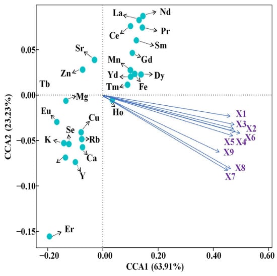 As can be seen from Table 4, the canonical correlation analysis (CCA) extracted a total of 9 groups of typical variables, of which 7 groups of typical variables had a correlation coefficient of 0.317, and 8 groups of typical variables had a correlation coefficient of 0.111. As can be seen in Figure 2, when CCA1 was taken as a benchmark, the contents of Nd, La, Pr, Sm, Gd, Mn, Yb, Dy, Fe, Tm, and Ce were positively correlated with soil elemental content, and Eu, Cu, Rb, K, Se, Ca, Tb, and Y were negatively correlated with soil elemental content, of which the content of Ho in tea was weakly correlated with soil elemental content; when CCA2 was taken as a benchmark, the content of Zn, and Sr in tea was positively correlated with soil elemental content, Eu, Cu, Rb, K, Se, Ca, Tb, and Y were positively correlated with soil elemental content, and Eu, Cu, Rb, K, Se, Ca, Tb, and Y were positively correlated with soil elemental content. The contents of Eu, Cu, Rb, K, Se, Ca, Tb, and Y were negatively correlated with the soil element contents, and the content of Mg in tea was weakly negatively correlated with the soil element contents. At the same time, the soil characteristics of the different regions (pH, EC, etc.) are shown in Table 5. Among them, the highest pH value was found in Bangdong, which was significantly different from the other two regions (p < 0.01). The lowest EC value was found in Ning’er, which was highly significantly different from the other two regions (p < 0.01).