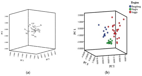 Through the above effects of region, tree age and their interaction on the isotope ratios and mineral contents of Pu-erh tea, 22 characteristic mineral elements related to the regions, including Mg, Mn, Fe, Zn, Rb, Sr, Y, La, Pr, Nd, Sm, Eu, Gd, Tb, Dy, Ho, Er, Tm, Yb, Lu, δ13C and δ15N were screened. The screened 22 characteristic mineral elements were subjected to principal component analysis of different regions, and the results are shown in Table S2. Four principal components were obtained with a cumulative contribution of 82.54%. Principal component 1 mainly contains δ13C, δ15N, Fe, Cu, Sr, Y, La, Pr, Nd, Sm, Eu, Gd, Tb, Ho, Er, Tm, Yb and Lu, and the contribution rate is 57.76%, principal component 2 mainly contains δ15N, Cu, Sr, Y, Pr, Nd, Sm and Dy element information, and the contribution rate is 13.43%, principal component 3 mainly contains the information of δ15N and Mg, Cu, Rb, Pr, Nd, Sm, Eu, Tb and Dy elements, and the contribution rate is 6.76%, principal component 4 mainly contains δ13C, Fe, Cu, Rb, Sr and La information with a contribution rate of 4.60%. The four most important variables were Nd, Sm, Eu, Gd, Tb, Ho, Er, Tm, Yb and Lu in PC1, and δ15N, Sr, Y and Dy in PC2, and Mg in PC3, respectively (Figure 3a). Meanwhile, three origin samples (Ning’er, Jinggu, Bangdong) were correctly distinguished. And they are distributed in different spatial regions. It shows that the selected mineral elements and stable isotope origin traceability fingerprint can be used to distinguish Pu-erh tea from different origins (Figure 3b). The Pu-erh tea samples from three geographical origins were distributed in different spatial distributions. The results indicated that these elements could be used for the identification of the geographical origin of Pu-erh tea.