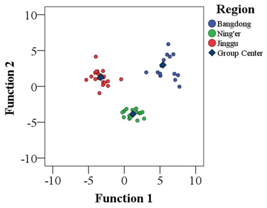 Principal component analysis (PCA) is used to transform a set of correlated variables into a set of uncorrelated principal components (PCs) that explain the greatest possible amount of variation in the data, and to provide a comprehensive data visualization [32]. Upon applying PCA to the analytical data for three geographical origins, tea samples could be preliminarily clustered (the first four PCs). In addition, we used Fisher’s linear discrimination analysis (LDA) to assess the effectiveness of the elements for the identification of tea origin traceability. Linear discriminant analysis (LDA) is a supervised procedure that maximizes the variances between categories and minimizes the variances within categories by creating new variables (discriminant functions). The reliability of the discriminant model was also verified by the cross-validation method (leave-one-out method).