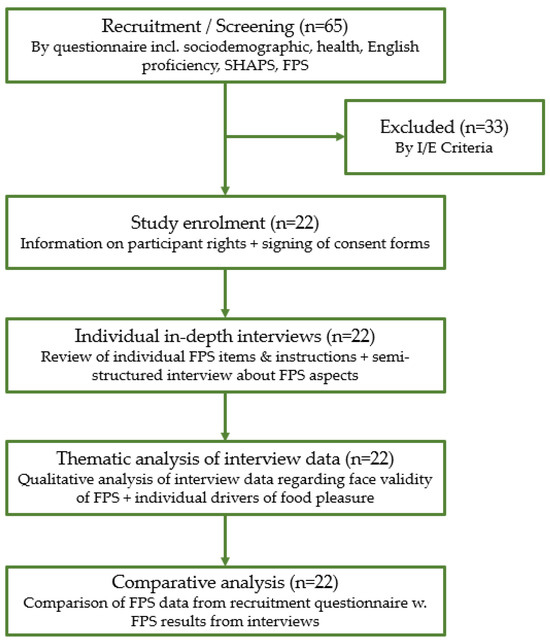 The current authors used an early version of the FPS in multiple consumer studies [27,28,29,30]. These studies were all designed as consumer surveys, and each focused on clarifying the scale’s usage potential and sensitivity by clarifying regularly occurring differences among different consumer segments and if disease-related anhedonic traits were associated with food-related anhedonic traits. For example, one study focused on cross-cultural differences in drivers of food-related pleasure [27], and another examined consumer segments’ characteristics in relation to the main drivers of food pleasure [28]. The remaining two focused on presumed anhedonic consumer groups, specifically individuals experiencing chronic stress [29], and whether anhedonic traits associated with depression or anxiety could be recognized in drivers of food-related pleasure [30]. These studies have demonstrated the applicability and appropriateness of the FPS for various scientific purposes and contexts. However, it is crucial to evaluate the comprehensibility, content validity, and ease of use of the FPS by end users if it is to be continued and recommended for further use in consumer studies. The current study aimed to assess the face validity and consistency reliability of the FPS in measuring food pleasure preferences among a non-anhedonic adult consumer group. A mixed-methods approach was employed to achieve this, comparing quantitative FPS survey data with qualitative interview responses. In-depth interviews were particularly relevant for this study, as they allowed participants to express their experiences freely and extensively regarding using the FPS and their individual food pleasure preferences. This approach facilitated the collection of qualitative data to evaluate participant acceptance of the existing instrument’s content and format and to explore any new aspects of food pleasure perception that were deemed relevant to consumers. Therefore, the specific objectives of this research were to perform the following: