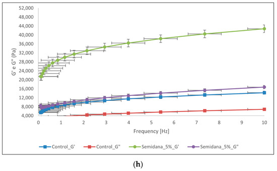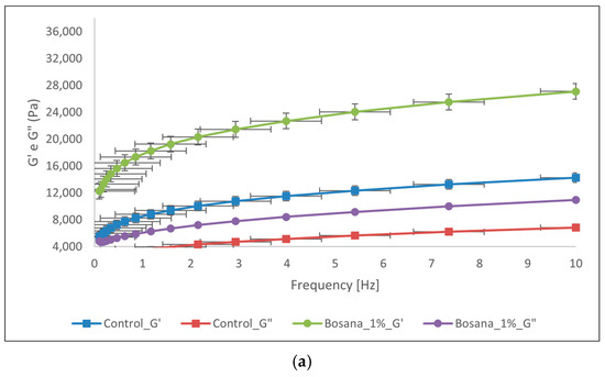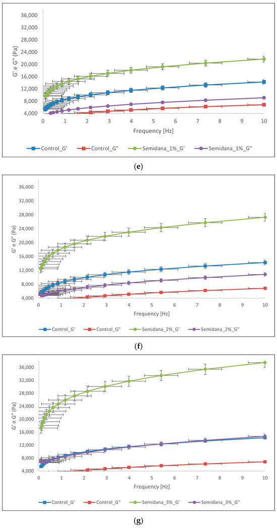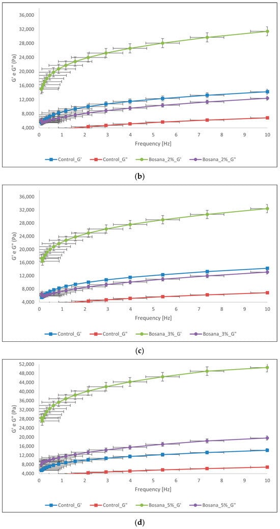 In all samples, G′ was greater than G″, as shown in all parts of Figure 2, and both moduli increased as the frequency increased. Having a G′ that is greater than G″ means that the dough’s consistency is semi-solid and elastic—the necessary consistency for bread dough [2,63,71].