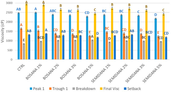 Effect of different OP inclusion percentages on the pasting properties of dough, peak viscosity (peak), holding strength (trough), the difference between the peak and trough (breakdown), final viscosity, and the difference between final viscosity and trough (setback). Error bars indicate the standard error. Different letters within the same group of graph bars indicate significantly different means as assessed by one-way ANOVA, followed by Tukey HSD (p-value < 0.05).