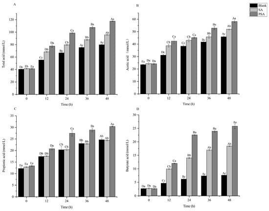 Contents of SCFAs in the PSA, SA, and blank groups under different fermentation times. (A) Acetic acid; (B) propionic acid; (C) butyric acid; (D) total acid. Values are means ± SEM. Different capital letters (A, B, C, D, and E) indicate that the same experimental group has significant differences (p < 0.05) at different fermentation time points. Different lowercase letters (a, b, and c) indicate that different experimental groups have significant differences (p < 0.05) at the same fermentation time point.